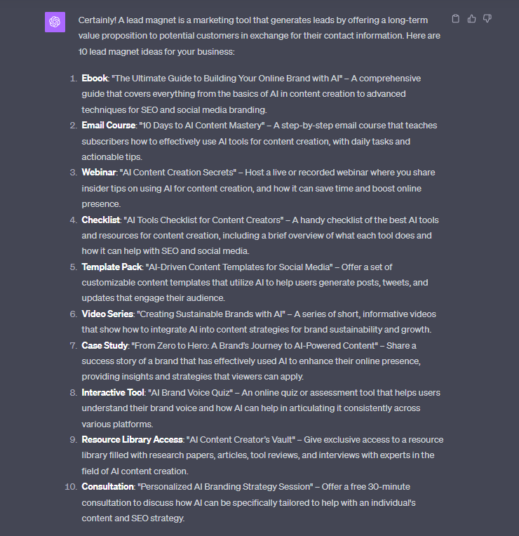 Chat GPT can help you come up with lead generator ideas that are irresistible. It's about creating a one-time investment that keeps on giving, drawing in leads while you focus on other aspects of your business.