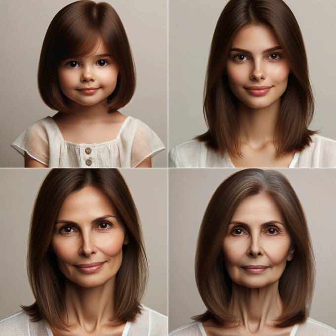 same woman, 4 different ages, 5 years, 20 years, 40 years and 60 years. don't vary anything else just vary the age