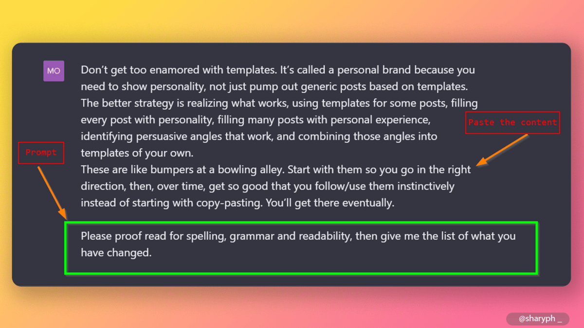 “Please proofread for spelling, grammar, and readability, then give me the list of what you have changed. “