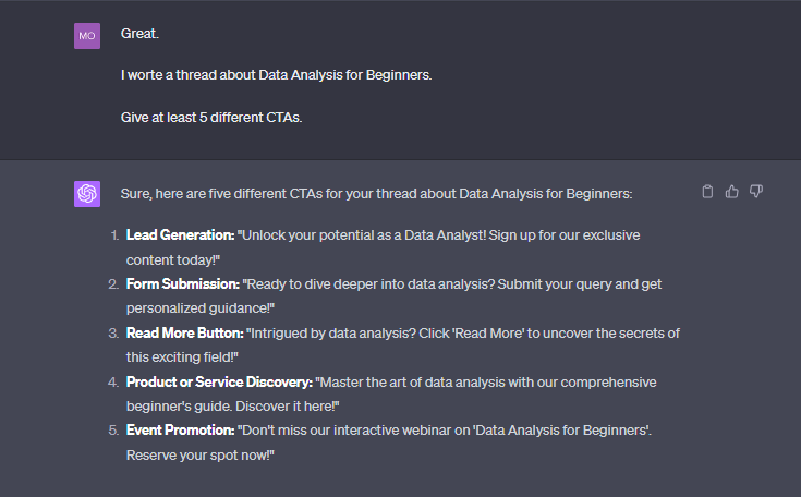 I wrote a thread about Data Analysis for Beginners. Give at least 5 different CTAs.”