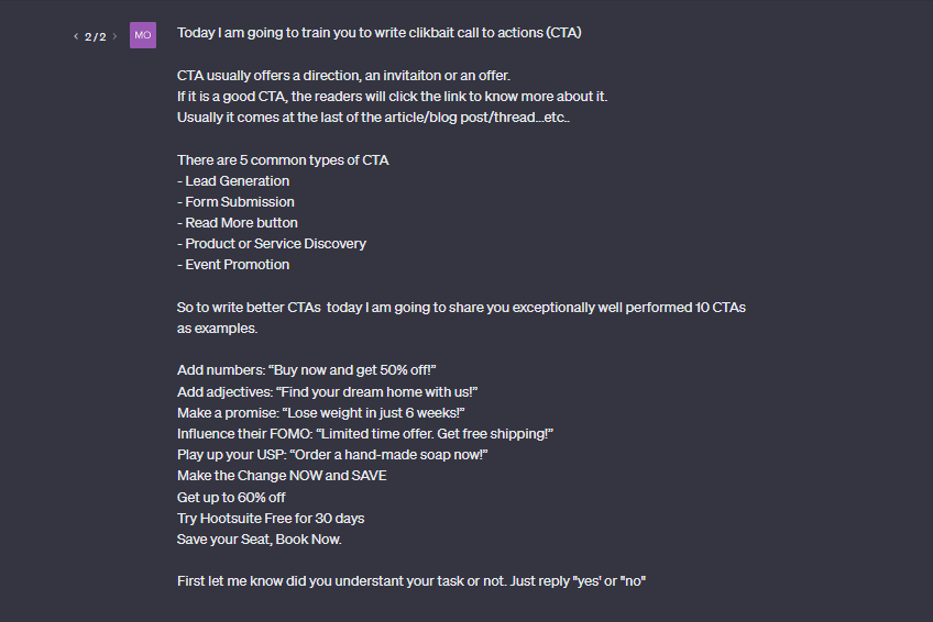 Prompt: “Today I am going to train you to write clickbait call to actions (CTA) CTA usually offers a direction, an invitation or an offer.